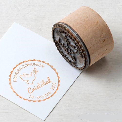 Sello redondo personalizado para Comunión con paloma Ø3,5×2,5cm