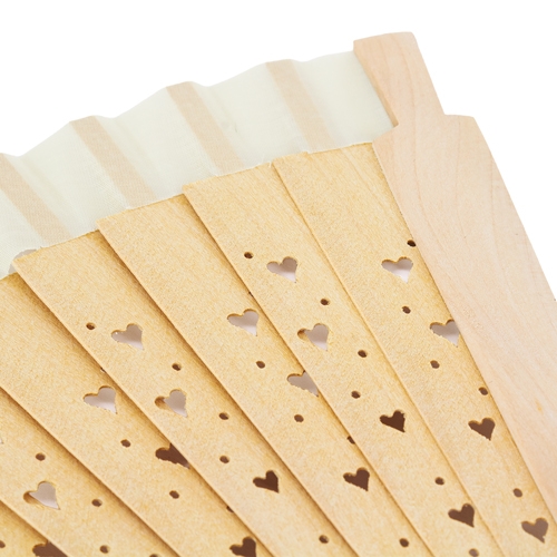 Las varillas de madera están decoradas con corazones tallados, aportando un toque romántico y especial que lo convierte en un recuerdo perfecto para bodas.