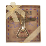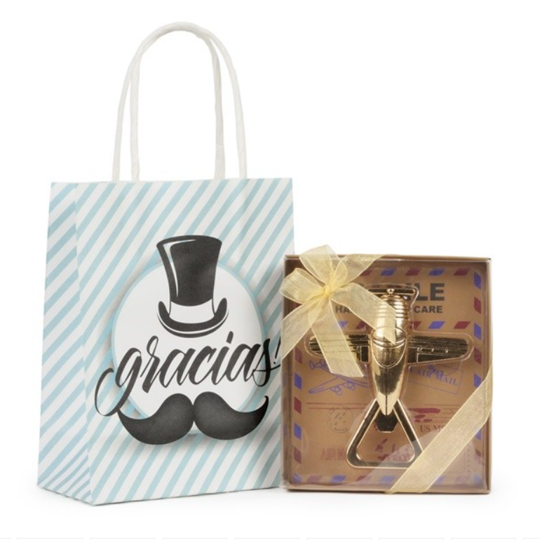 • El abridor en forma de avión se presenta en una caja de regalo ideal con un diseño de correspondencia aérea antigua con lazo de raso dorado dándole un toque original y vintage a este detalle con tapa transparente.