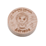 - El detalle de comunión está fabricado en madera natural con imán trasero y el diseño de una niña vestida con traje de comunión y pequeñas palomas sobrevolando a su alrededor. Le acompaña el texto «Mi primera comunión» junto a la fecha y el nombre de la niña.