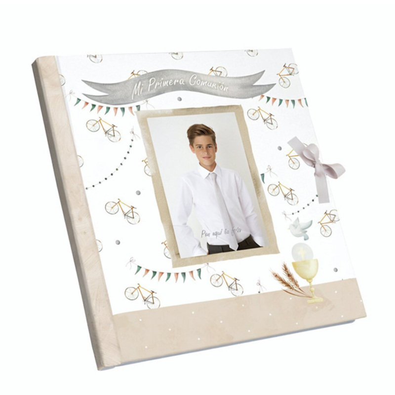 El Álbum de Fotos Comunión con diseño de bicicleta unisex es una opción perfecta para guardar los momentos más especiales de la Primera Comunión, tanto para niño como para niña.