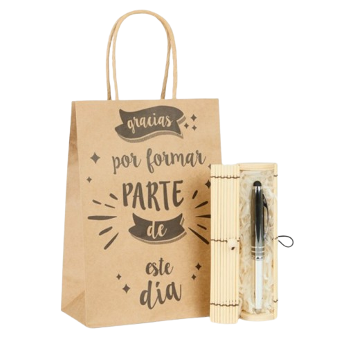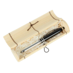 - El detalle de boda se presenta en estuche de bambú con cierre elástico para una mayor protección del bolígrafo, evitando posibles golpes y rozaduras.