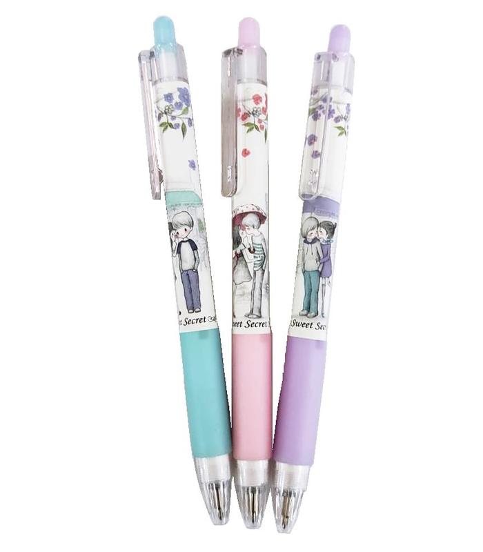 - Se trata de un bonito bolígrafo con el dibujo de una pareja de niños contándose dulces secretos al oído. Un gracioso diseño que podrás encontrar en tres colores diferentes: rosa, azul y lila.