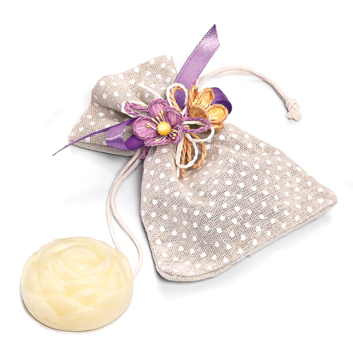 Bolsita rústica estampada topos con 1 jabón y ramito de flores.