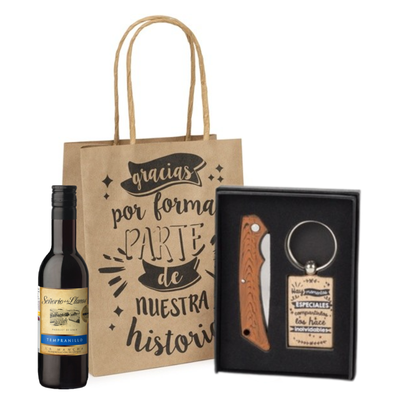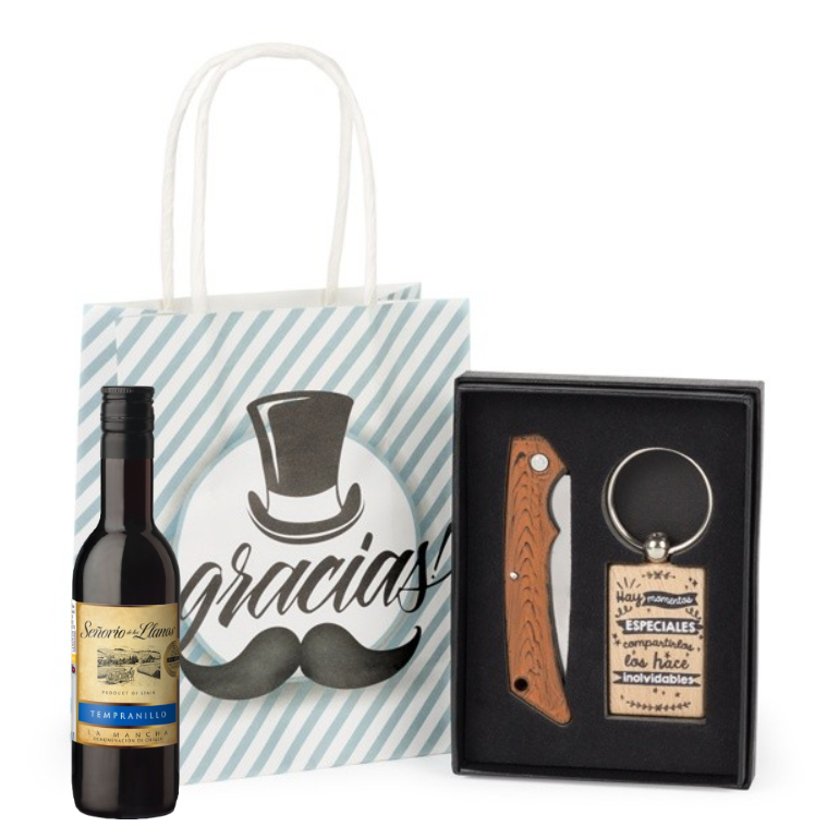 Pack Botella de vino con llavero de madera y navaja detalle de boda:
