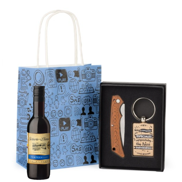 detalle boda hombre Vino con llavero de madera con frases y navaja