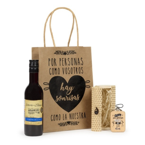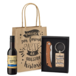 Pack botella vino y llavero madera regalo boda
