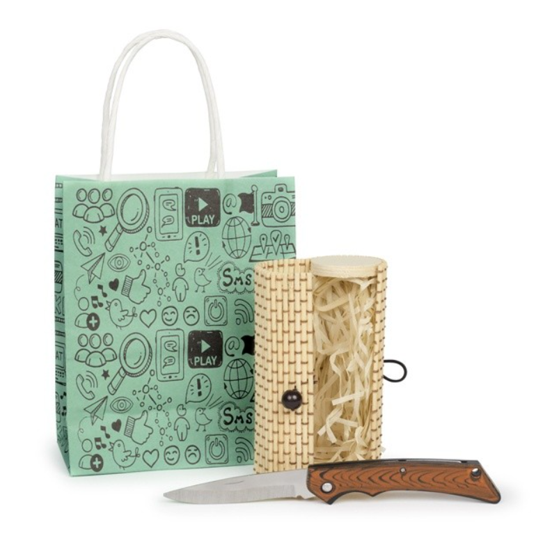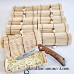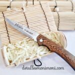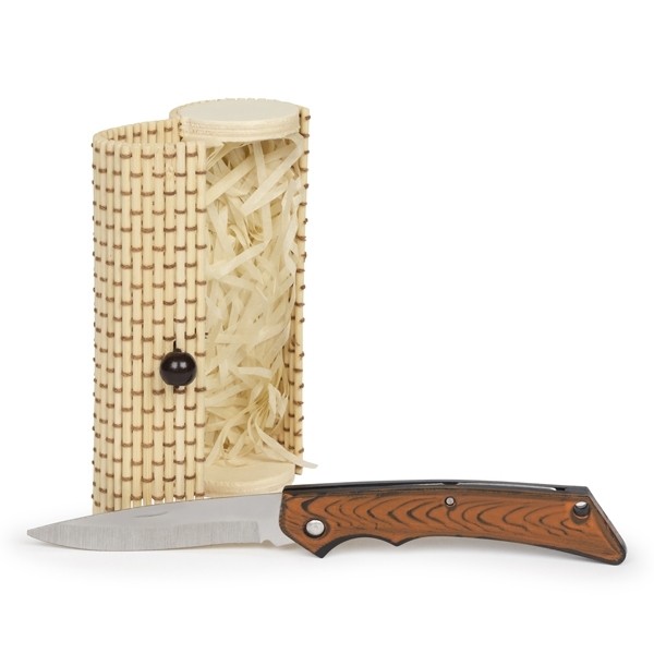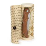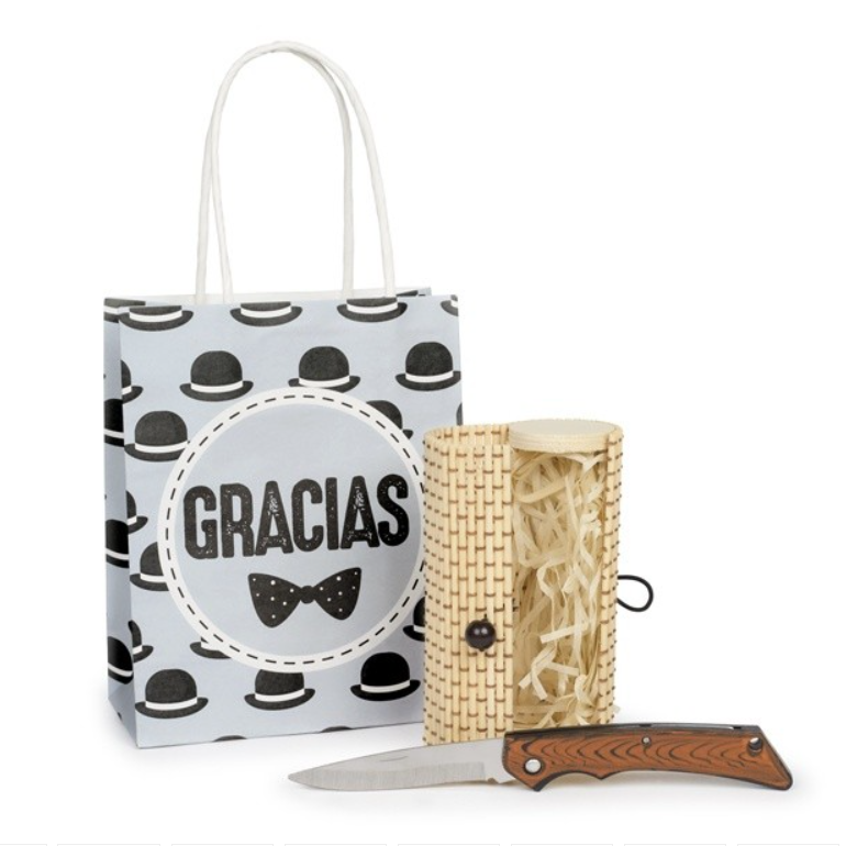 • Se presenta en un original estuche de bambú combinado con madera, con cierre de bola también en madera. Protegiendo la navaja entre papel de rafia, creando así un bonito conjunto para tus invitados.