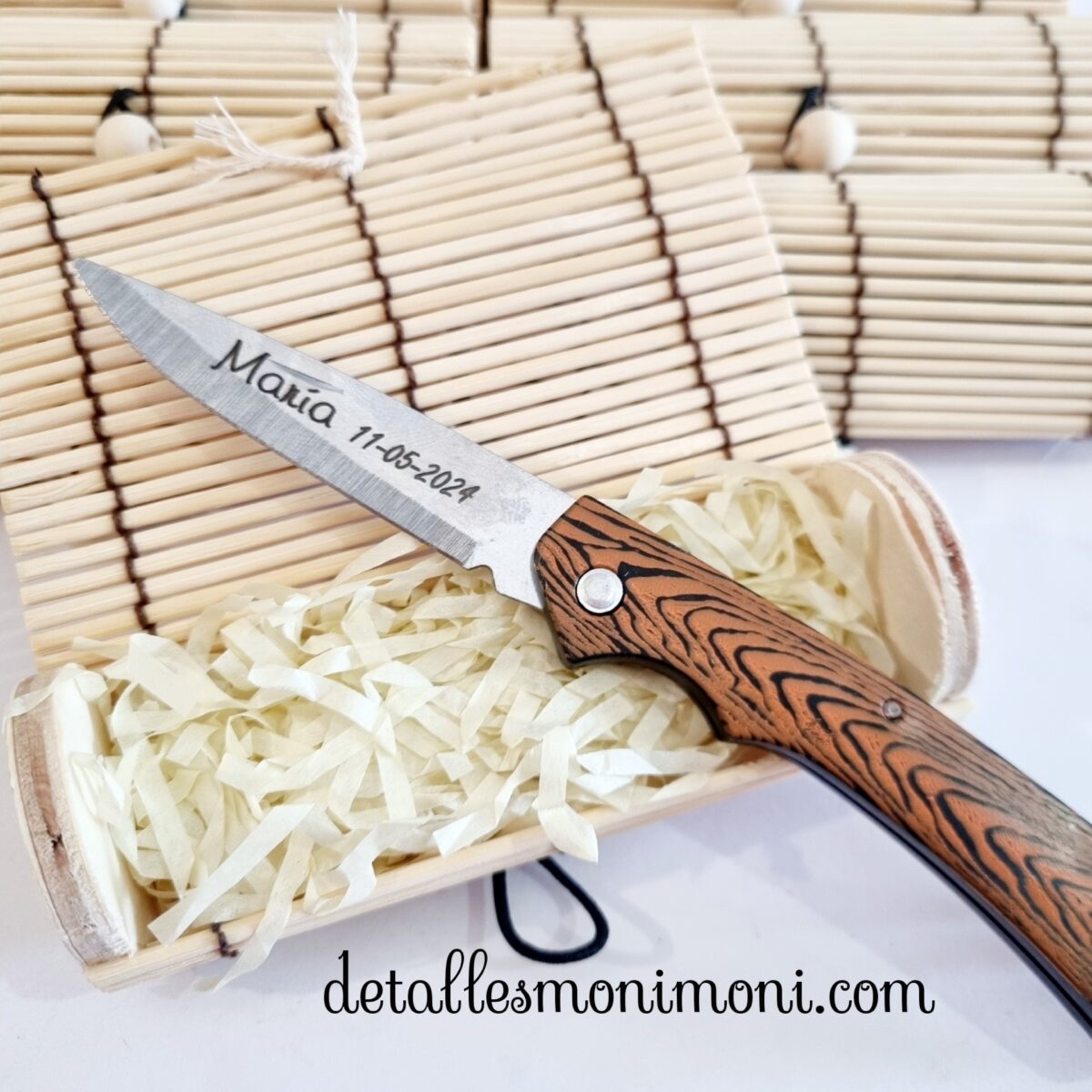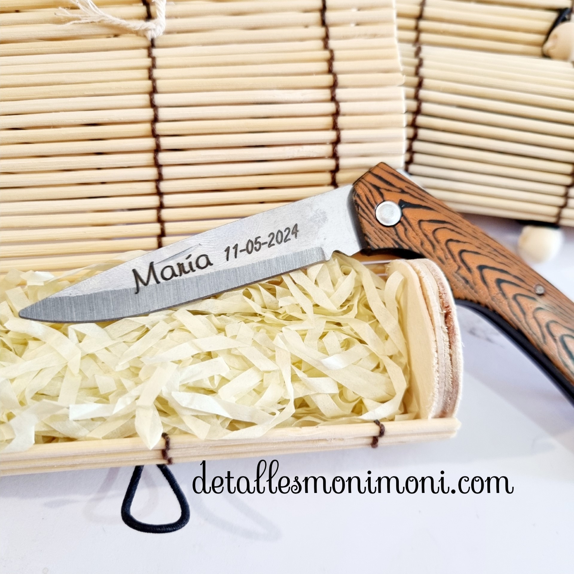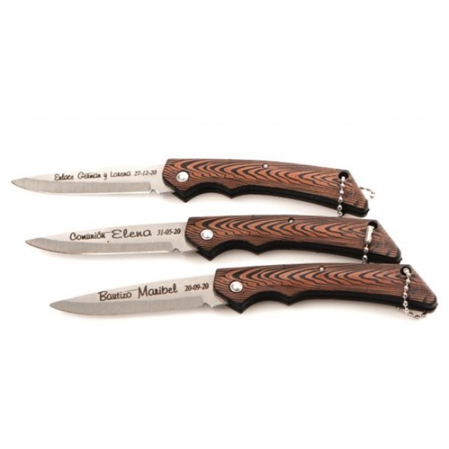 • Dicen que las navajas no se compran, sino que tienen que ser regaladas ya que los cuchillos se han considerado elementos muy poderosos durante siglos ¿Qué mejor que este evento para regalarlas? Diseñada en color plata con la veta de la madera en el mango y un pequeño agujero al final para poder colgar en el llavero con una arandela.