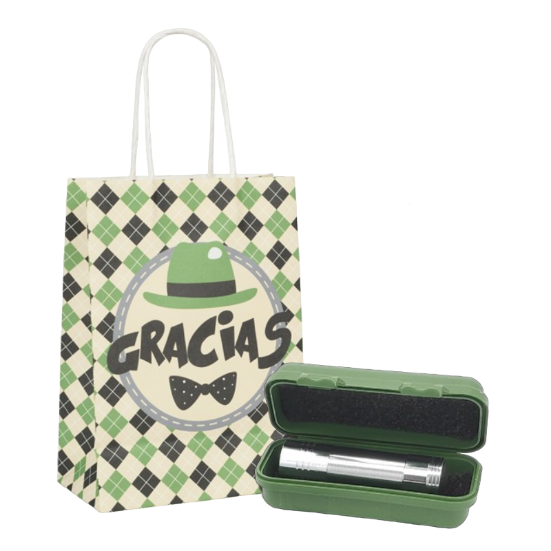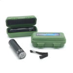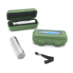 • La medida de la linterna es de 8.5 cm x 2 cm y la medida de la caja es de 11 cm x 4.5 cm.