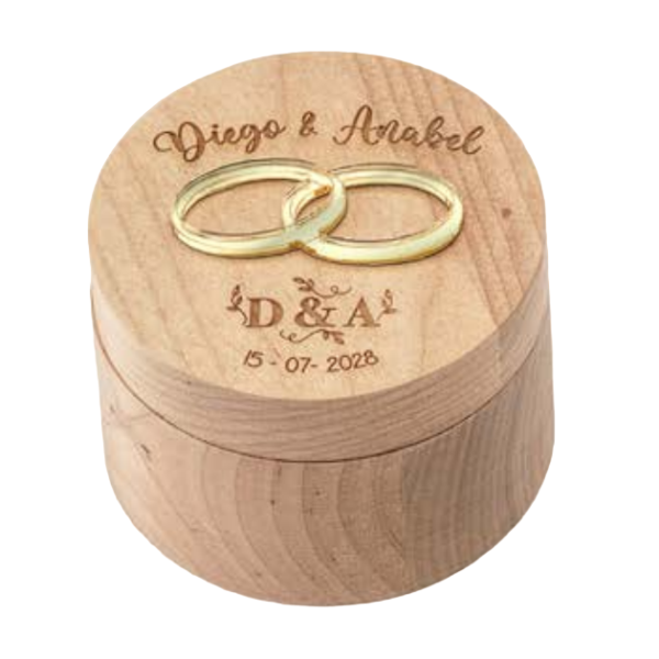 - La cajita porta alianzas está fabricada en madera natural con forma circular y tapa magnética, unida con dos pequeños imanes al estuche, es una idea diferente para bodas rústicas, originales y románticas.