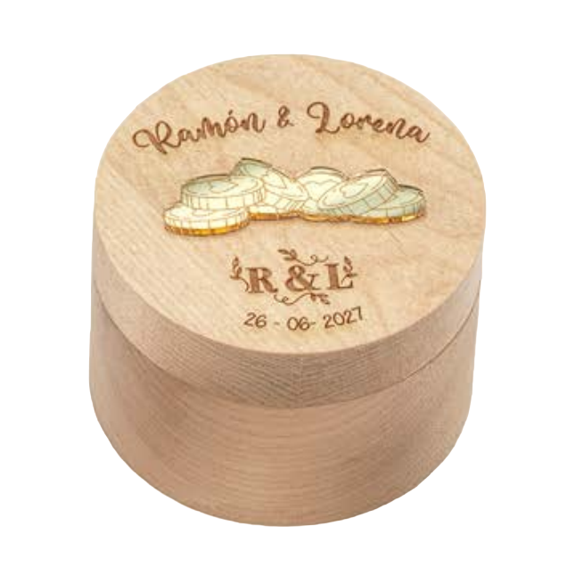 Más detalles sobre “Caja madera porta arras doradas personalizada” detalle para boda: