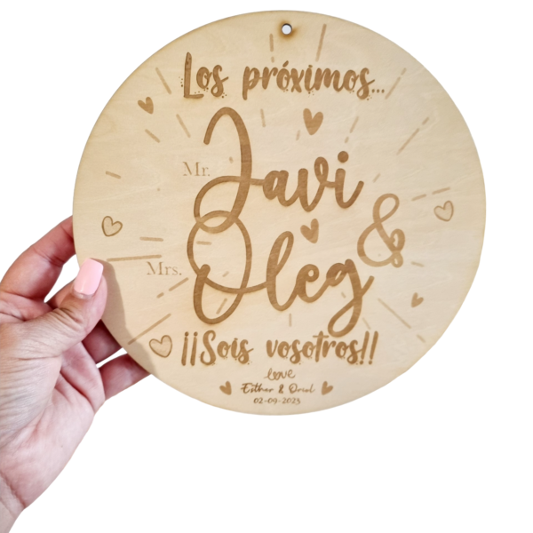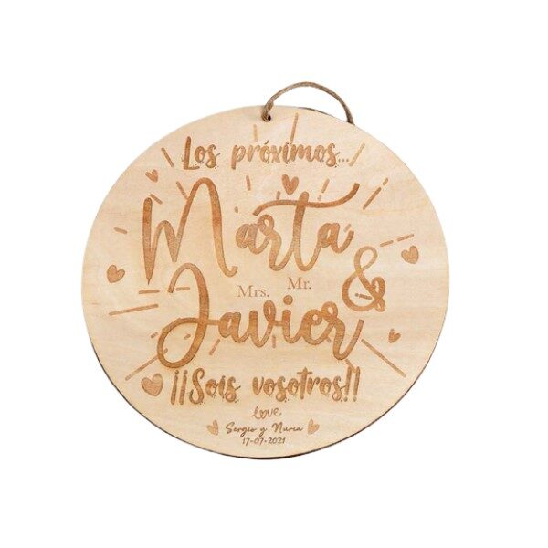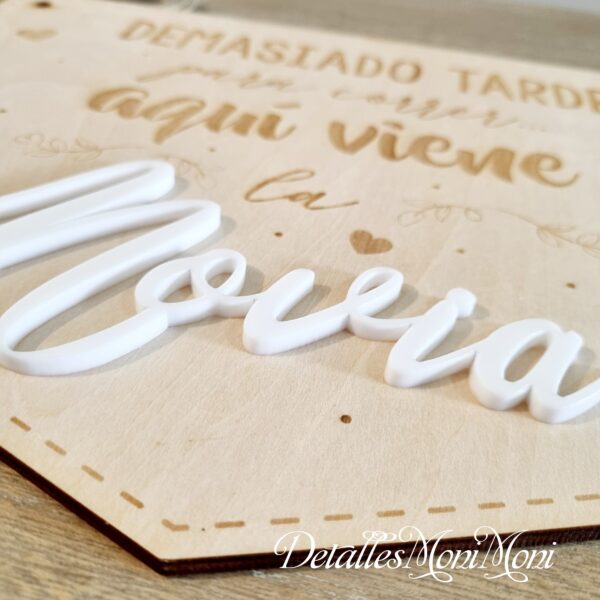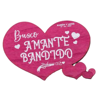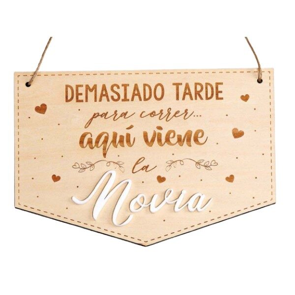 - Es un cartel muy gracioso fabricado en madera, con el detalle de dos globos y varios corazones volando, quedando la sala con una alegre decoración.