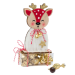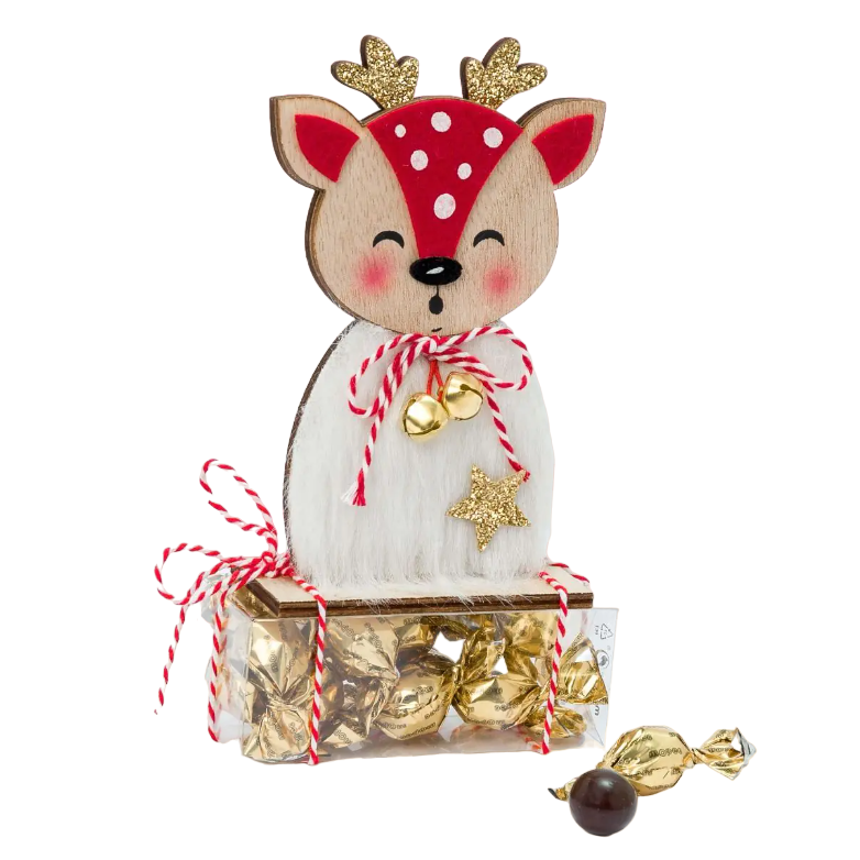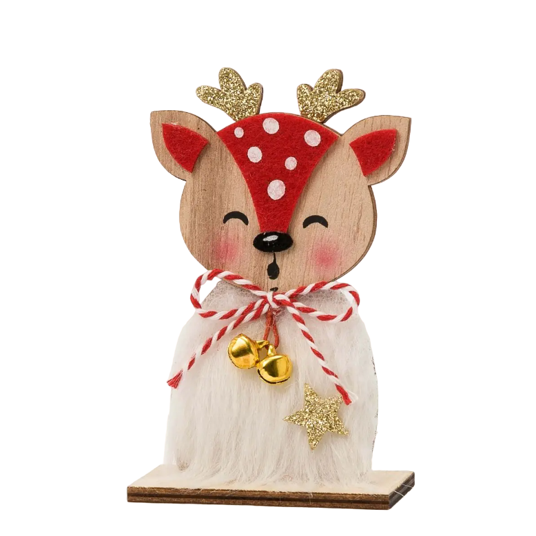 Simpático Cervatillo de madera con pelaje blanco y dos divertidos cascabeles, perfectos para decorar cualquier estancia de la casa u oficina y darle un toque navideño. Accesorio ideal para complementar un regalo de Navidad y ponerla sobre una barra de turrón o una caja de bombones y obsequiar a un amigo, familiar o cliente en estas fiestas.