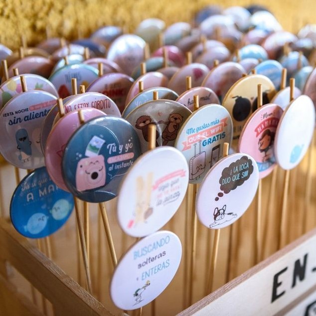 • Anima la fiesta de tu boda o el photocall con estas divertidas chapas.
