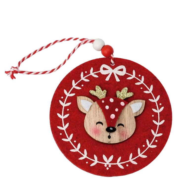 • Colgante de fieltro rojo con un simpático cervatillo de astas doradas en madera en el centro