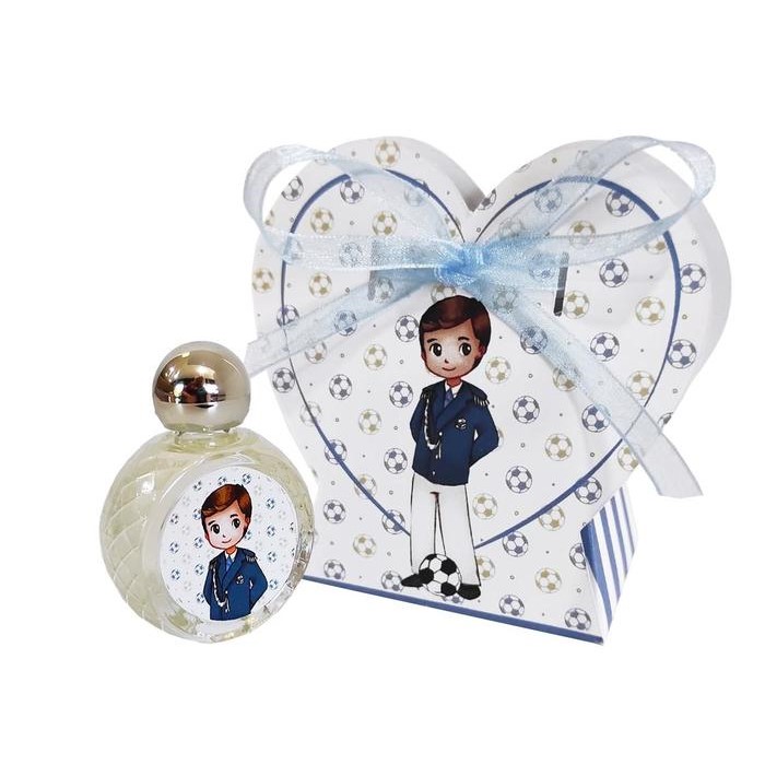 - Esta colonia se acompaña de una cajita estilo romántico en forma de corazón con la frase, “Mi Primera Comunión”, con balones de futbol por el fondo