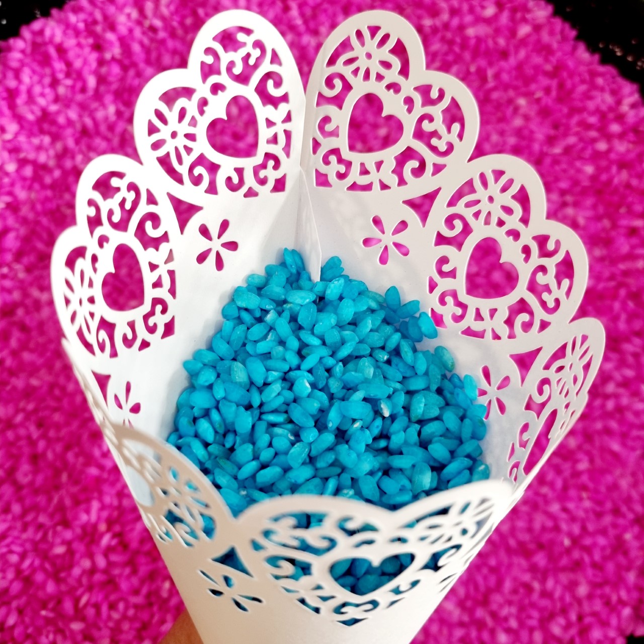 - Elegante lote de 10 conos para el momento del arroz en la boda, un detalle muy útil para los invitados donde pueden llevar pétalos o arroz de una forma original.Este detalle de boda tiene un bonito diseño en papel con figuras de corazones troqueladas en el borde. Se sirven desmontados, incluyendo la cinta de doble para para pegarlos.