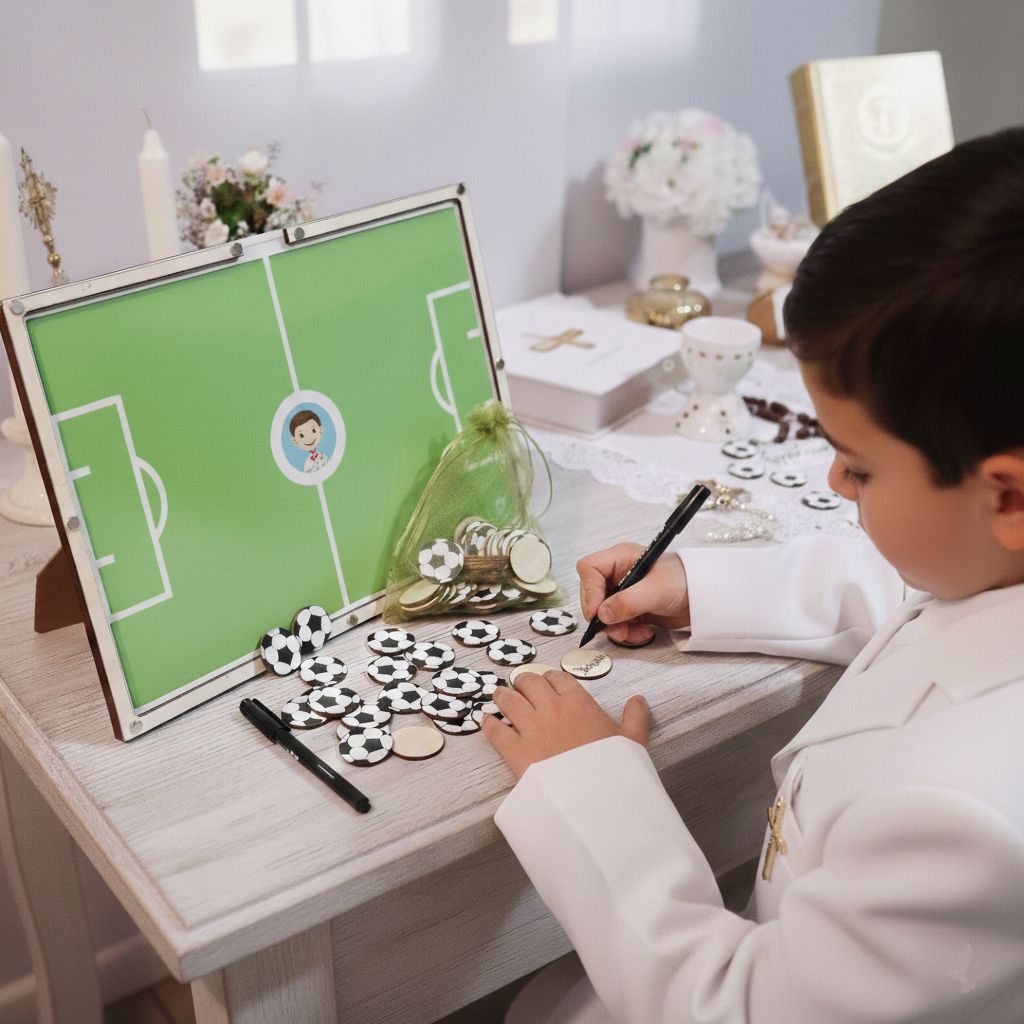 Sorprende con un recuerdo original, divertido y lleno de personalidad gracias a nuestro Cuadro de firmas de Comunión Fútbol, un marco diseñado como si fuese un campo de fútbol, ideal para niños apasionados por este deporte 💒⚽✨.
