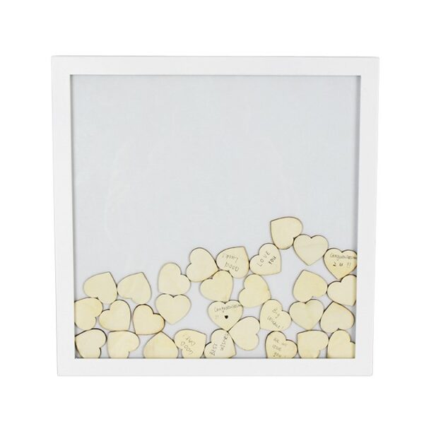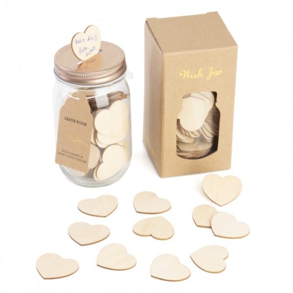 • Presentado en estuche de cartón con asa. El estuche contiene una ranura en la parte superior para poner meter los corazones de madera una vez hayan sido firmados.