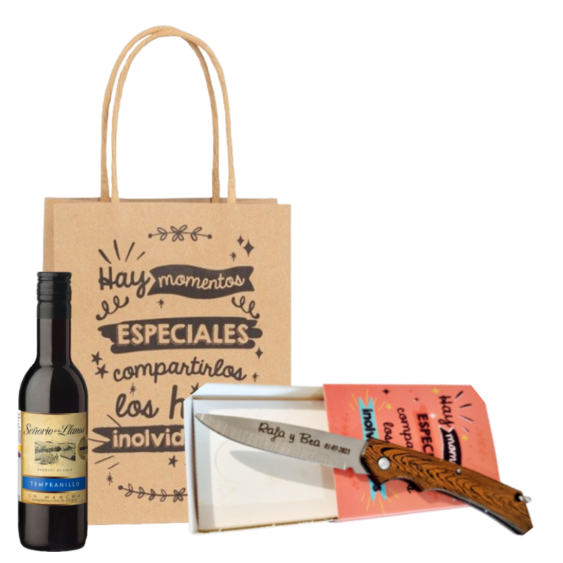 • El mejor de los pack como detalle de boda para tus invitados, no te lo pienses más! Con este acertarás seguro!! Consta de una botella de vino y una navaja presentada en una bonita caja con frases.