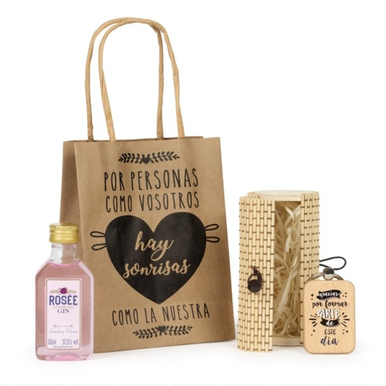 - Aquí te presentamos este detalle de boda para hombres, un pack completo que incluye llavero hombre en madera en caja de bambú, y miniatura de licor, crema, gin o ron a elegir, todo ello envuelto en una bolsa regalo de Kraft.