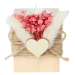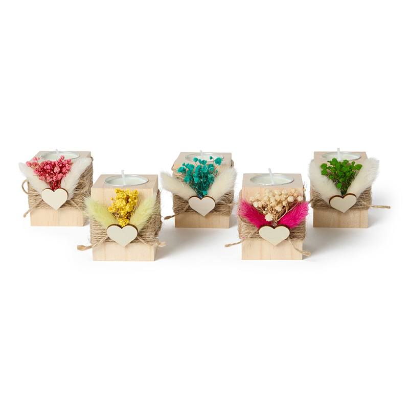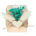 - En la base del porta velas se encuentra un pequeña vela redonda blanca. Acompaña a este precioso detalle de boda una decoración espectacular y muy colorida con flor preservada en los colores amarillo, rosa, verde, natural y turquesa. El ramillete, va prendido con un corazón de madera central y dos plumones de espiga seca, formando un precioso bouquet rústico perfecto para tus detalles de boda.