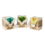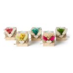 - Su diseño en cubo de madera natural con hilo de arpillera, le dará ese toque rústico tan bonito a tu boda y a los detalles en tendencia.
