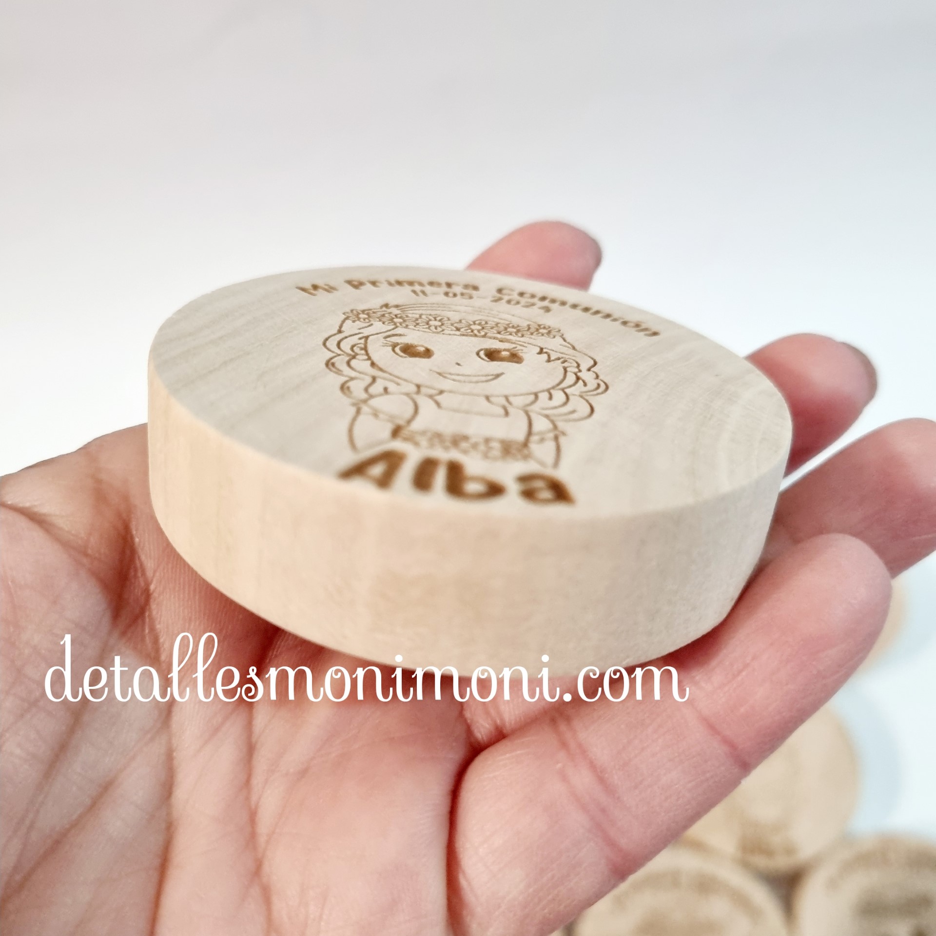 • Abrebotellas de madera con niña con corona es una de las mejores elecciones que puedes hacer para sorprender a los invitados de la comunión de tu hija.