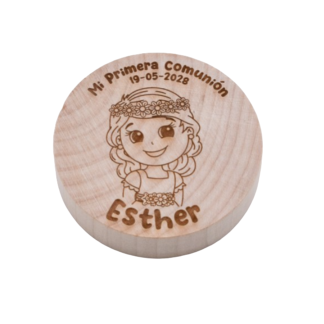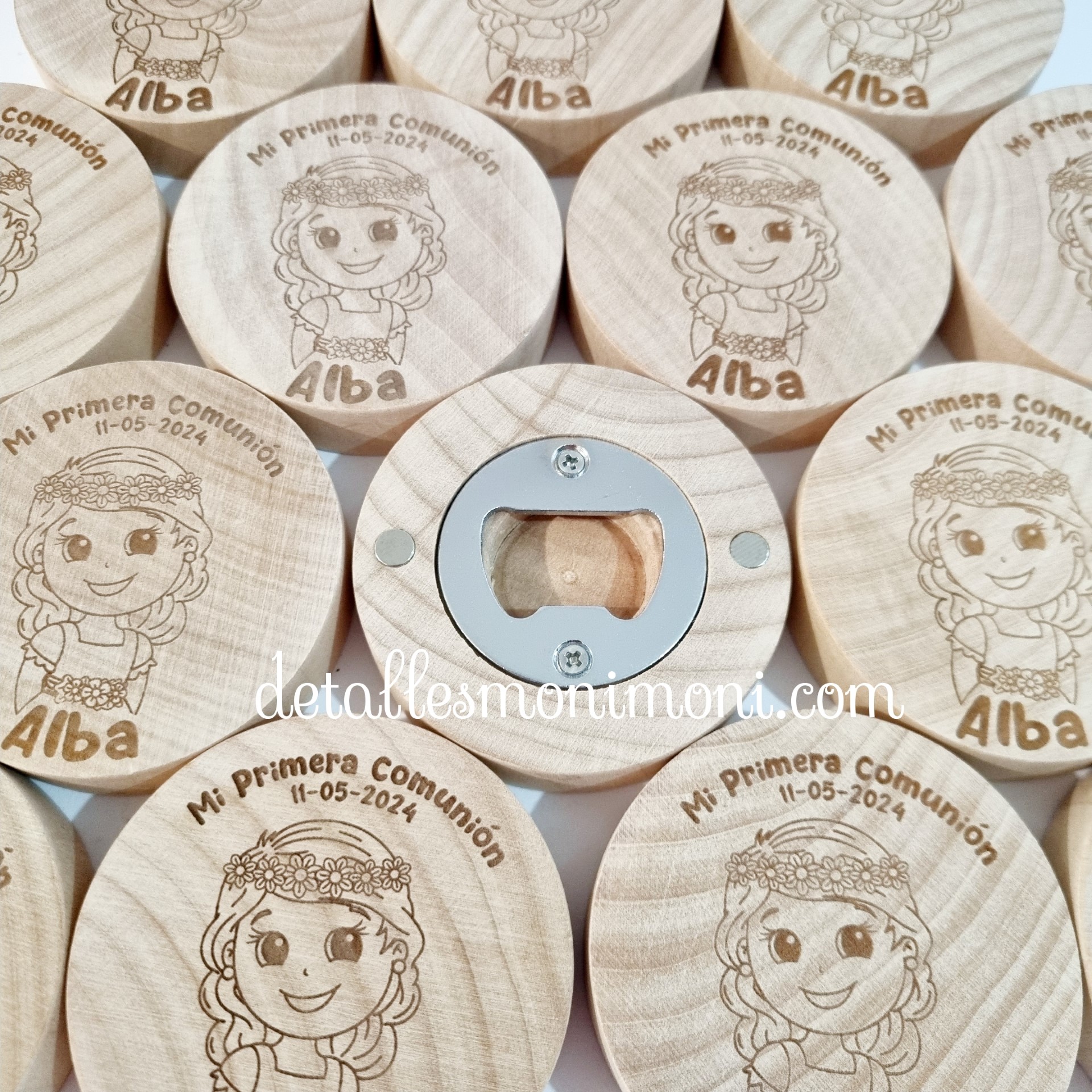 • Estos abridores vienen personalizados sobre madera natural con el diseño de una niña vestida de comunión con corona y fajín de flores, junto al nombre y fecha de la celebración.