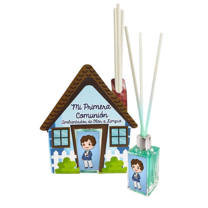 • Este detalle es un ambientador de mikado de comunión tiene un diseño de casita de lo más original, en su presentación con forma de casa encontrarás a un niño listo para celebrar su comunión.