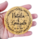 • Espejos redondo de madera con dibujo de un arco de hojas con mucho amor en su interior 😉 personalizado con nombres de los novios y fecha del evento incluido ya en el precio