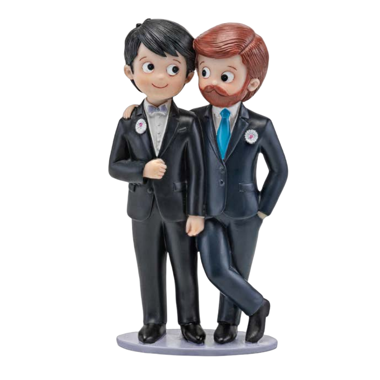 - Es una elegante figura donde los novios se miran cómplices, mientras el novio con barba le pasa la mano por el hombro del otro.