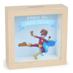 • Hucha madera detalle de Comunión útil y practico para niño, ya que empezarán a ahorrar mientras ven como aumenta sus ahorros a través de la ventana transparente. Una divertida y original hucha en madera con metacrilato que le recordará todos los días que es el mejor gracias al mensaje que lleva impreso.