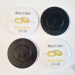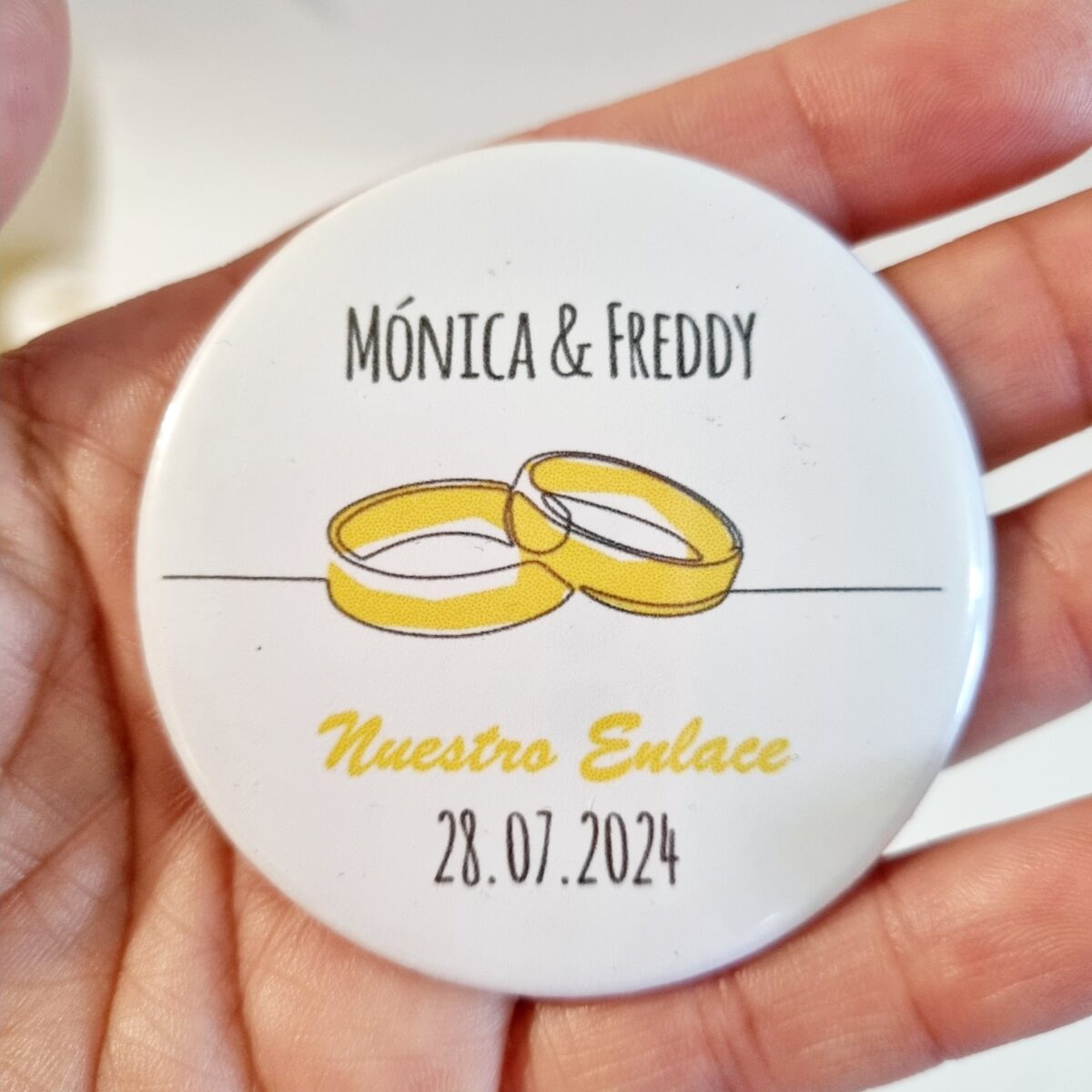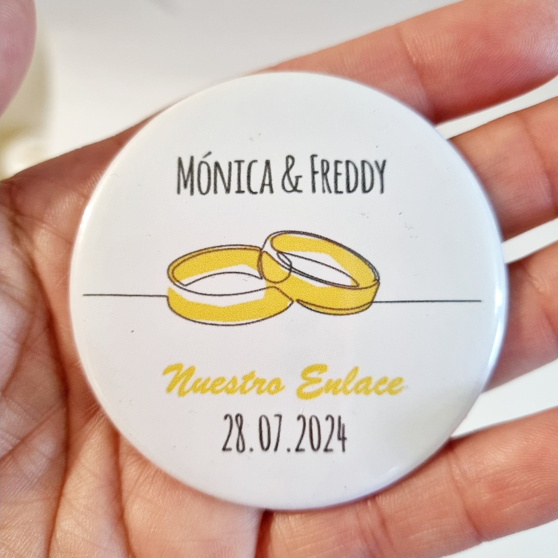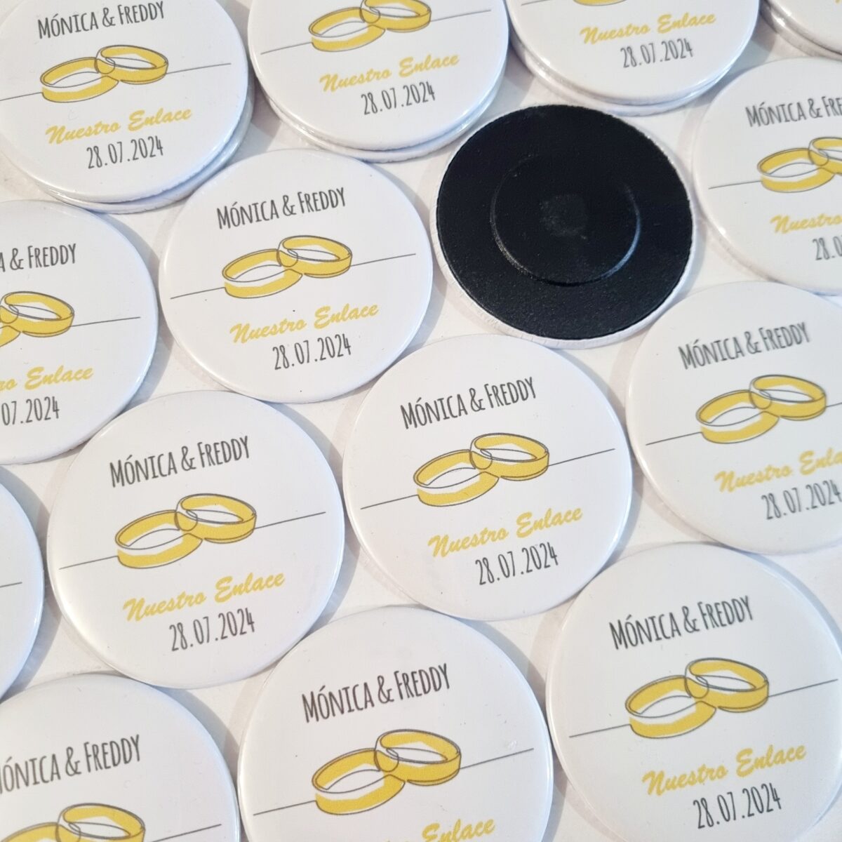 - Te presentamos nuestras chapas de imán personalizadas con nombres y fecha de la Boda, a su vez con unos bonitos anillos de boda entrelazados para poder poner en la nevera, así tus invitados cada vez que abran el frigorífico se acordarán de lo bien que lo pasaron en tu celebración.