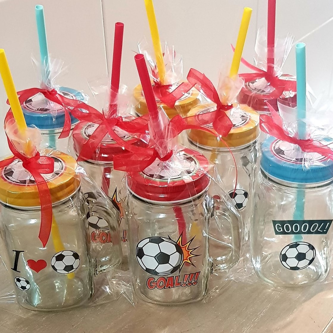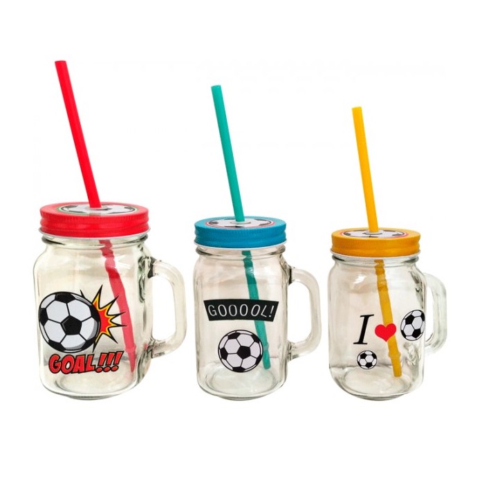 - Las jarritas de cristal incluyen una original tapa metálica con la imagen de una pelota de fútbol, con pajita de pvc a juego y se sirven surtidas en modelos y colores