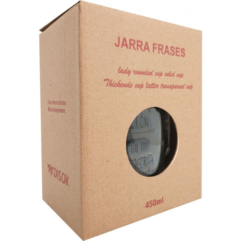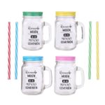 - Las jarritas de cristal incluyen una original tapa metálica con 4 colores a elegir , rosa, azul, verde y amarillo, con pajita de pvc a juego con la frase: