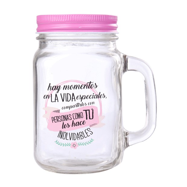 • Las jarritas de cristal incluyen una original tapa metálica con 4 colores a elegir , rosa, azul, verde y amarillo, con pajita de pvc a juego con la frase: