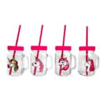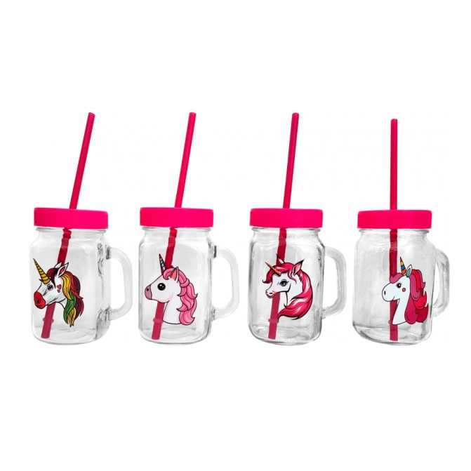 - Las jarras de cristal cuentan con 4 diseños mágicos de unicornio blanco con bonitas melenas de diferentes colores que combinan a la perfección con la tapa y pajita rosa de pvc.