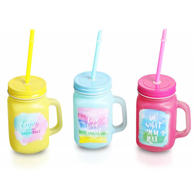 • Las jarras de cristal cuentan con 3 diseños diferentes colores que combinan a la perfección con la tapa y pajita de pvc.