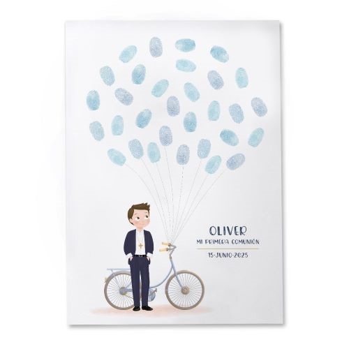 Esta es una idea original y divertida para comuniones donde los invitados pueden dejar su huella dactilar y sus nombres en cada una de las huellas dactilares que simulan unos globos en el aire. Con un diseño de niña con falda, tiene un estilo juvenil que permite substituir al libro de firmas tradicional de una manera más divertida para tan señalada fecha.