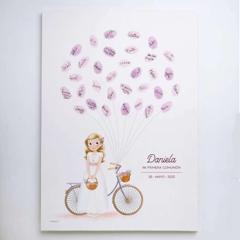 La lámina de firmas para comunión niña presenta un precioso árbol de huellas, donde familiares y amigos pueden dejar su huella dactilar, nombre o dedicatoria, creando un recuerdo único y emotivo 🌳✍️.