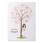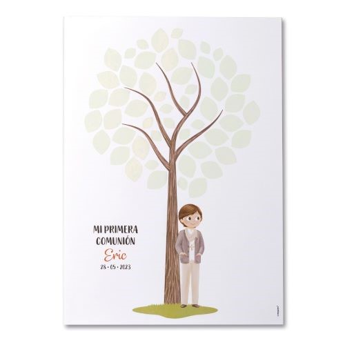 Esta es una idea original y divertida para comuniones donde los invitados pueden dejar su huella dactilar y sus nombres en cada una de las huellas dactilares que simulan unos globos en el aire. Con un diseño de niña con falda, tiene un estilo juvenil que permite substituir al libro de firmas tradicional de una manera más divertida para tan señalada fecha.