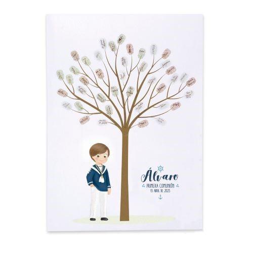 Esta es una idea original y divertida para comuniones donde los invitados pueden dejar su huella dactilar y sus nombres en cada una de las huellas dactilares que simulan unos globos en el aire. Con un diseño de niña con falda, tiene un estilo juvenil que permite substituir al libro de firmas tradicional de una manera más divertida para tan señalada fecha.