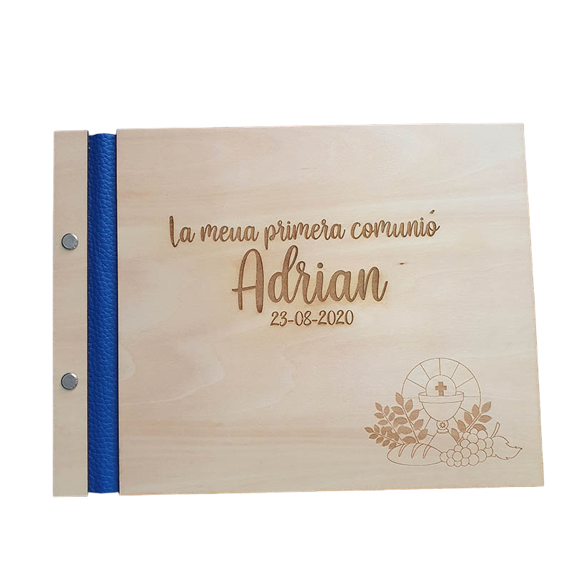 • Este original libro de firmas con tapas de madera y grabado a láser y franja de polipiel en azul es una muy buena opción si quieres hacerle un regalo especial al niño de la comunión.