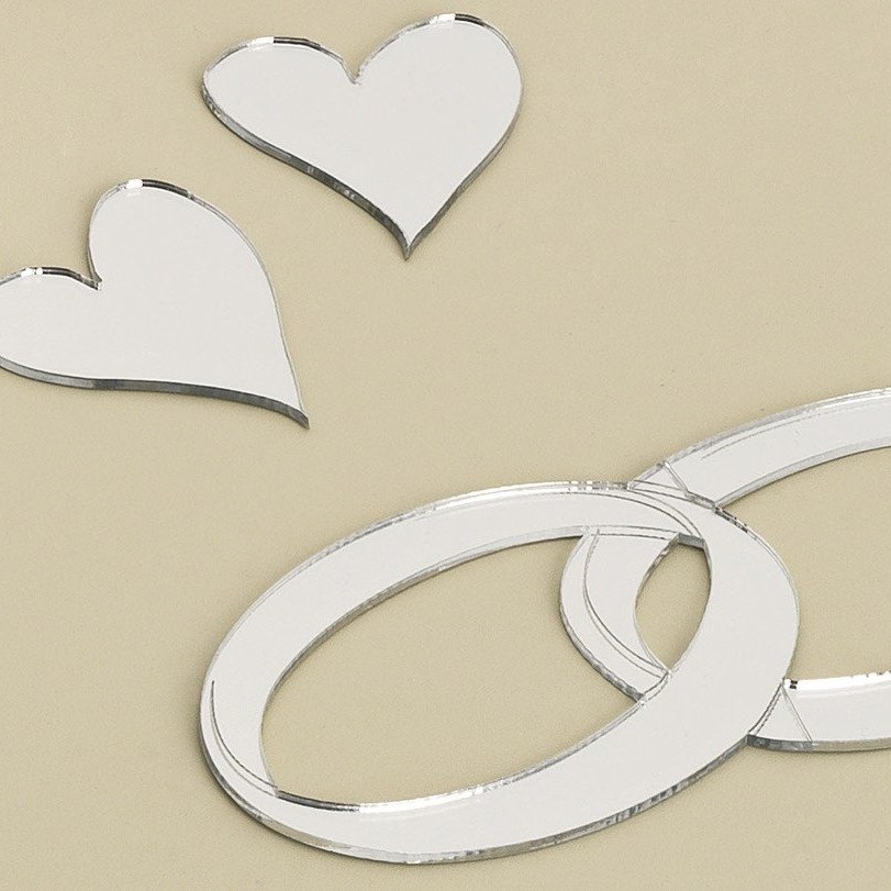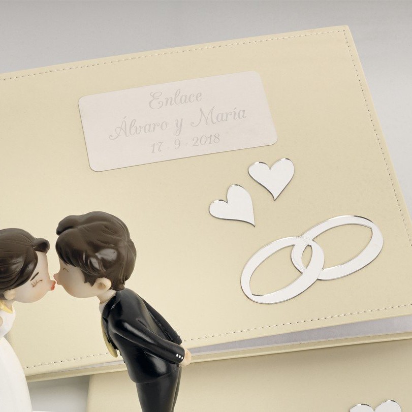 • Elegante libro de firmas grabado con el nombre de los novios y la fecha de la boda en una chapa metálica brillante de 15 x 8cm plateada.
