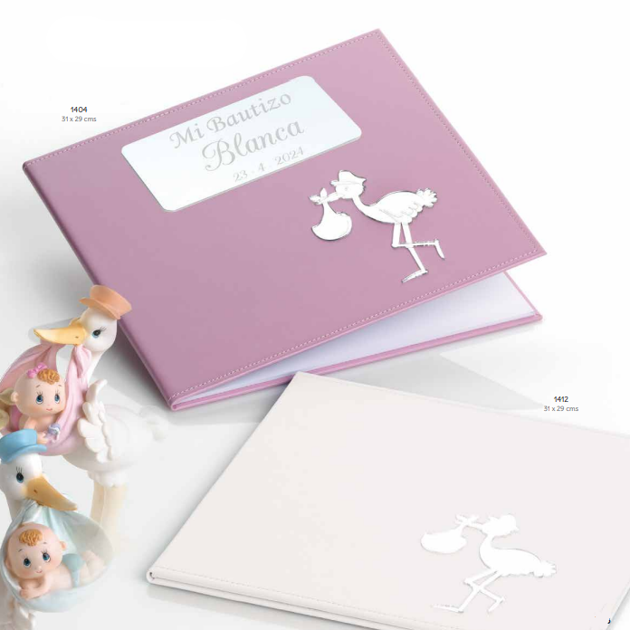 Libro en polipiel de color rosa o azul y con una cigüeña en metacrilato de espejo con 30 hojas en su interior en blanco para escribir. Personalizado con nombre y fecha opcional.