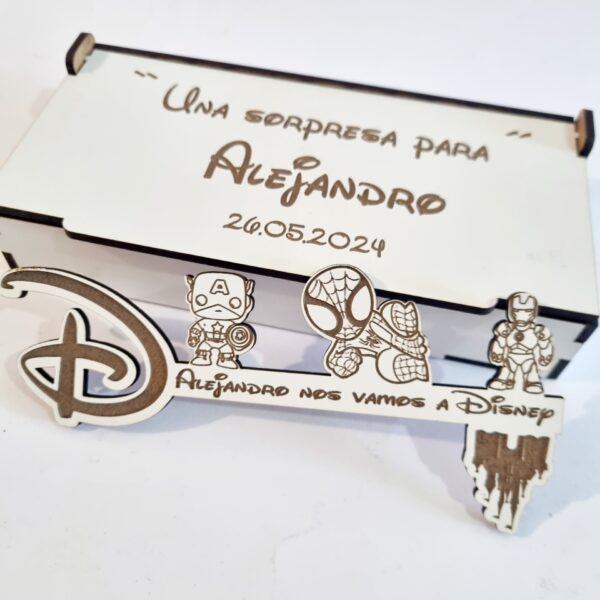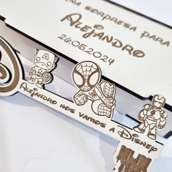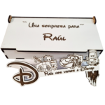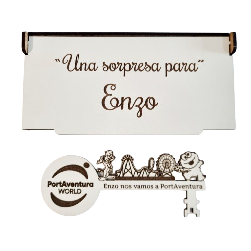 - Con unas medidas de la caja 16 cm x 8 cm aprox. con texto : – “Hay una sorpresa para ……. “ y la medida de la llave mágica 15 cm x 7 cm aprox. con opción de personalizar con grabado a láser