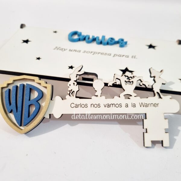 - Con unas medidas de la caja 16 cm x 8 cm aprox. con texto : – “Hay una sorpresa para ……. “ y la medida de la llave mágica 15 cm x 7 cm aprox. con opción de personalizar con grabado a láser