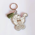 • Llavero de madera artesanal en forma de cochecito de bebé